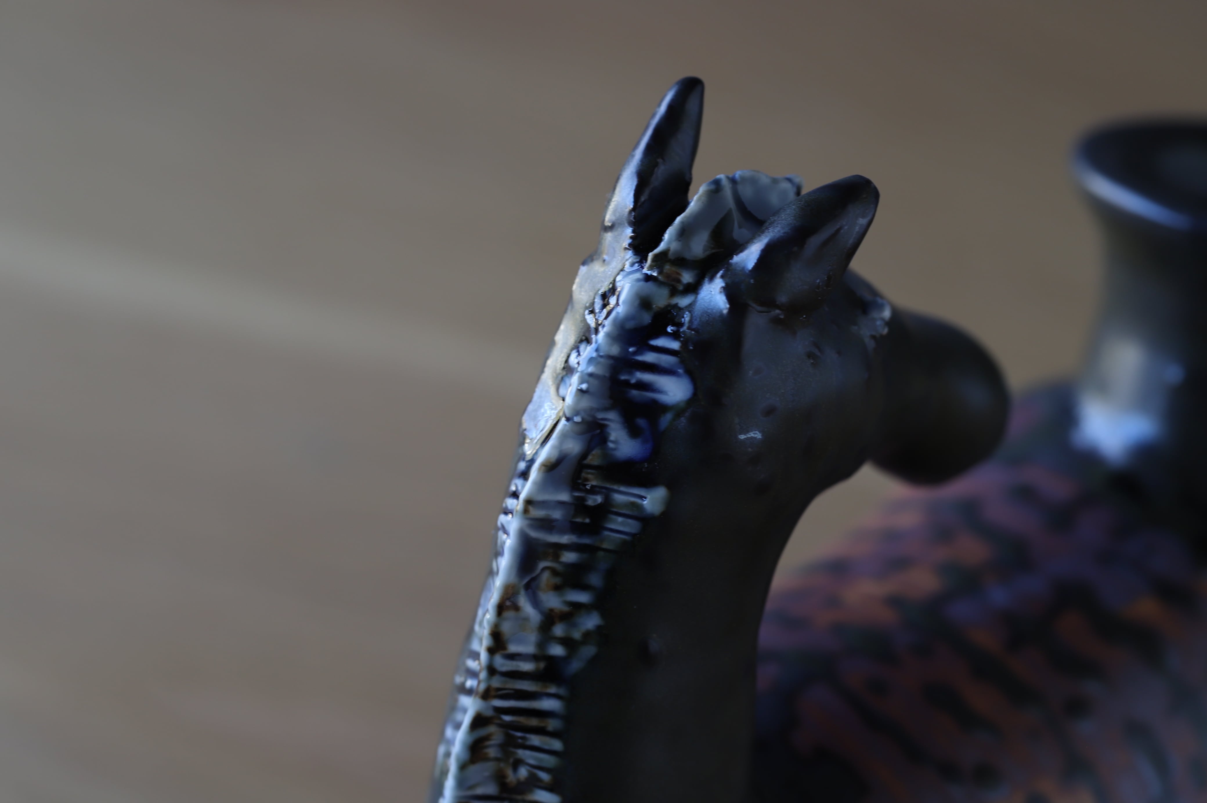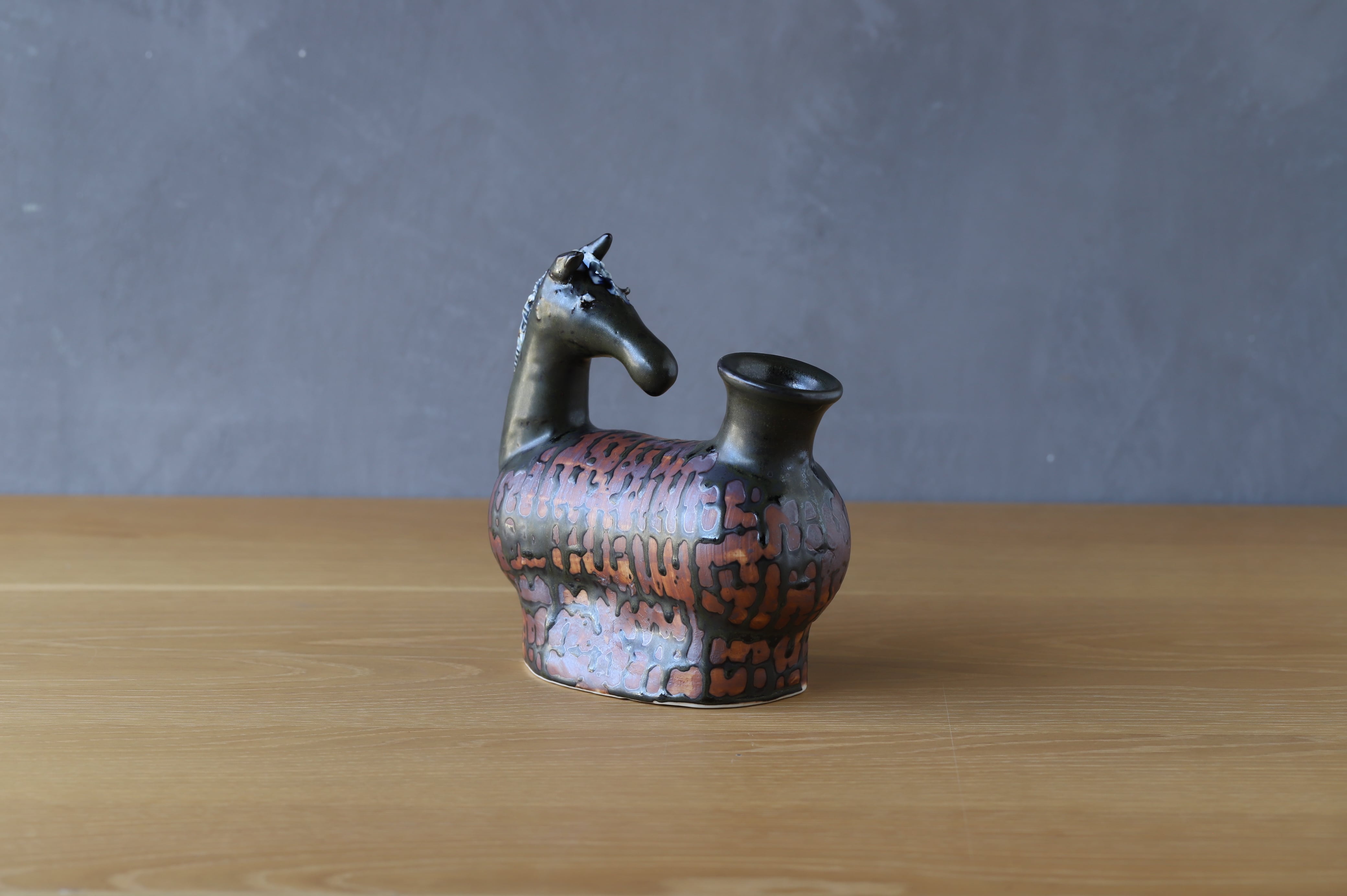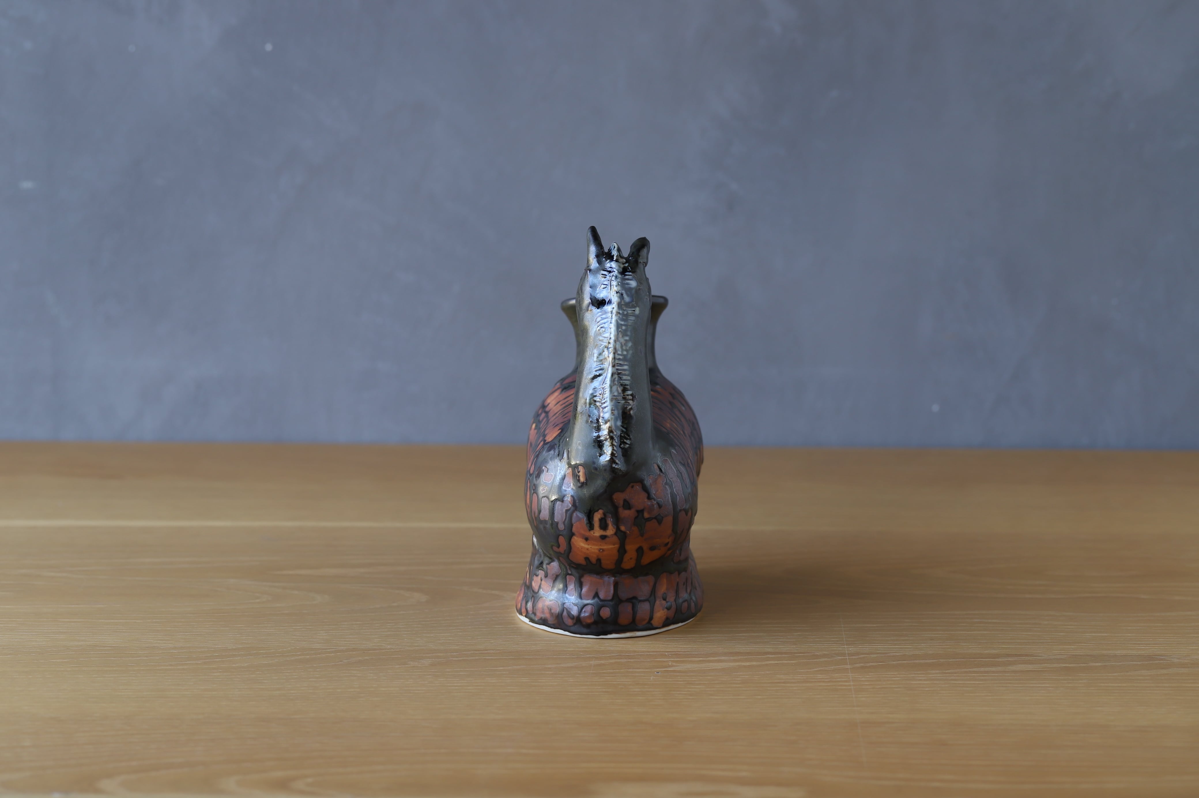 耳と立て髪以外はろくろで成形しています。様々な釉薬の流れとウマの躍動感が溶け込んだ作品です。