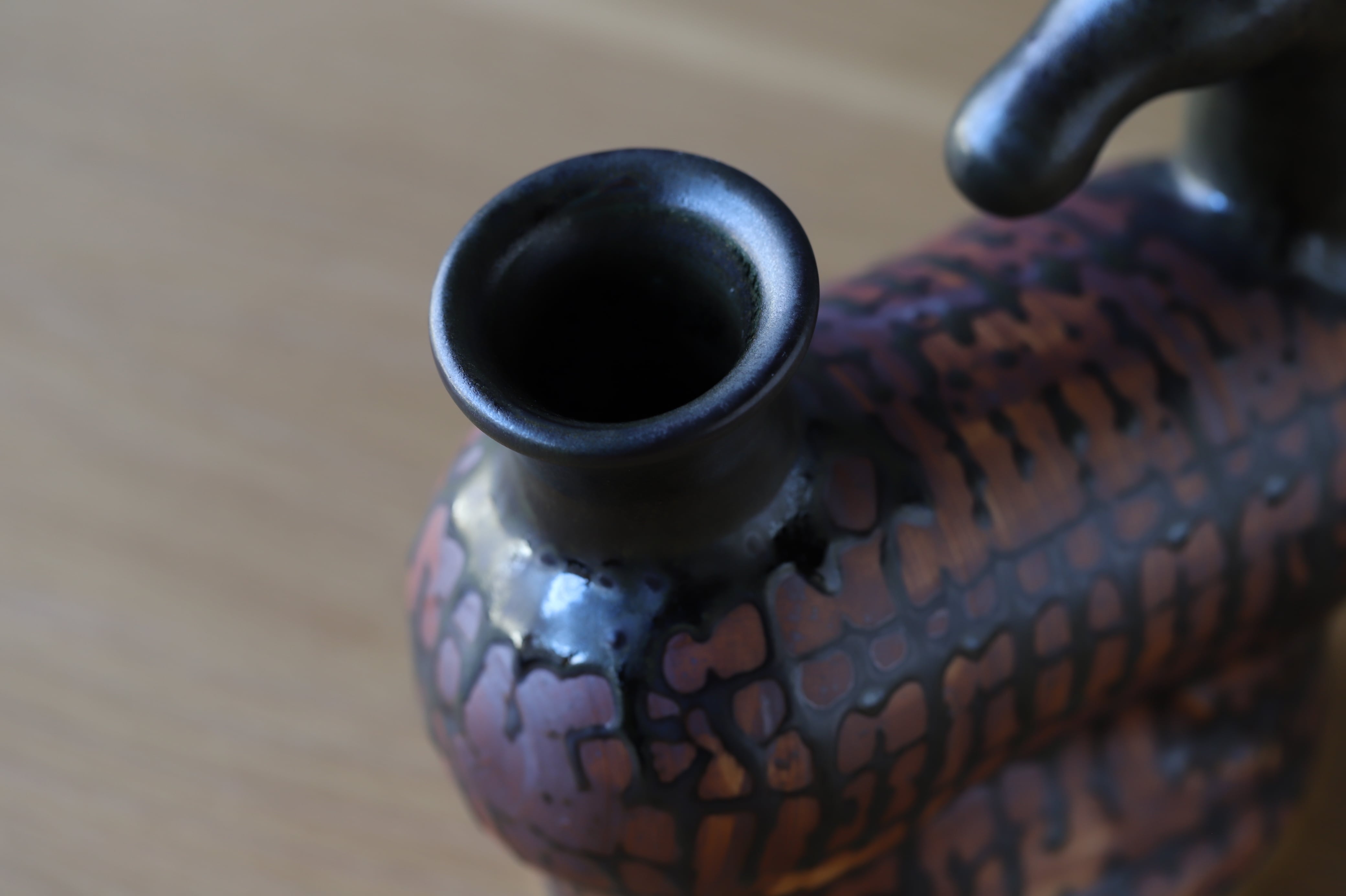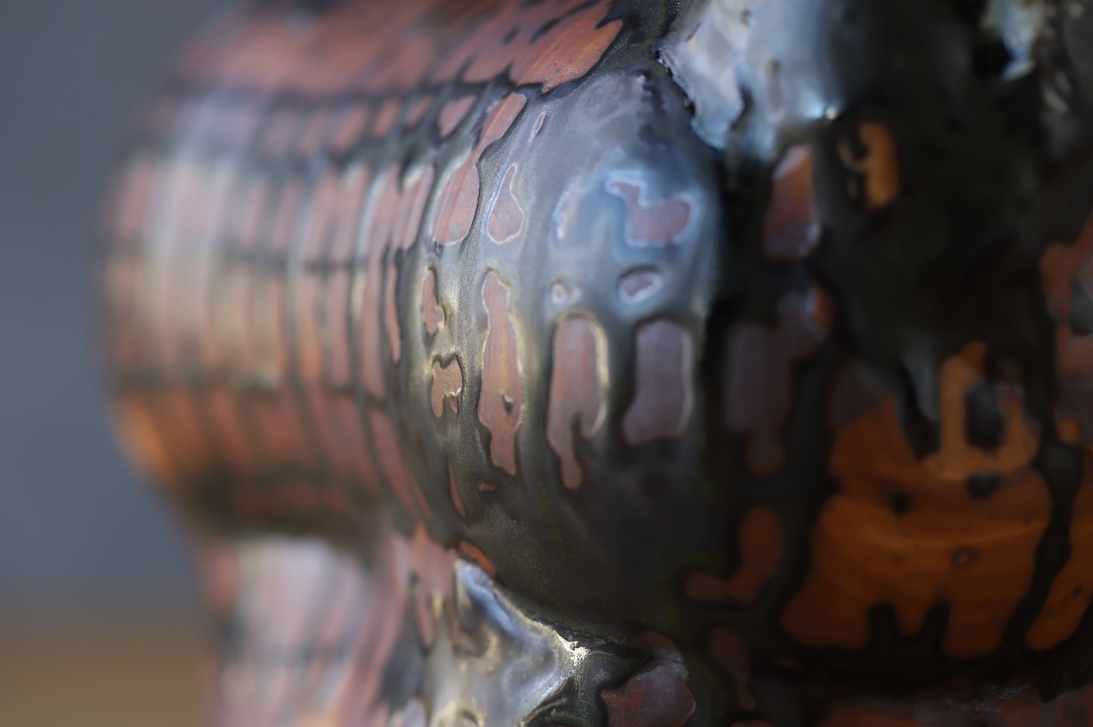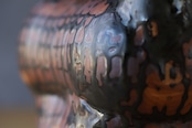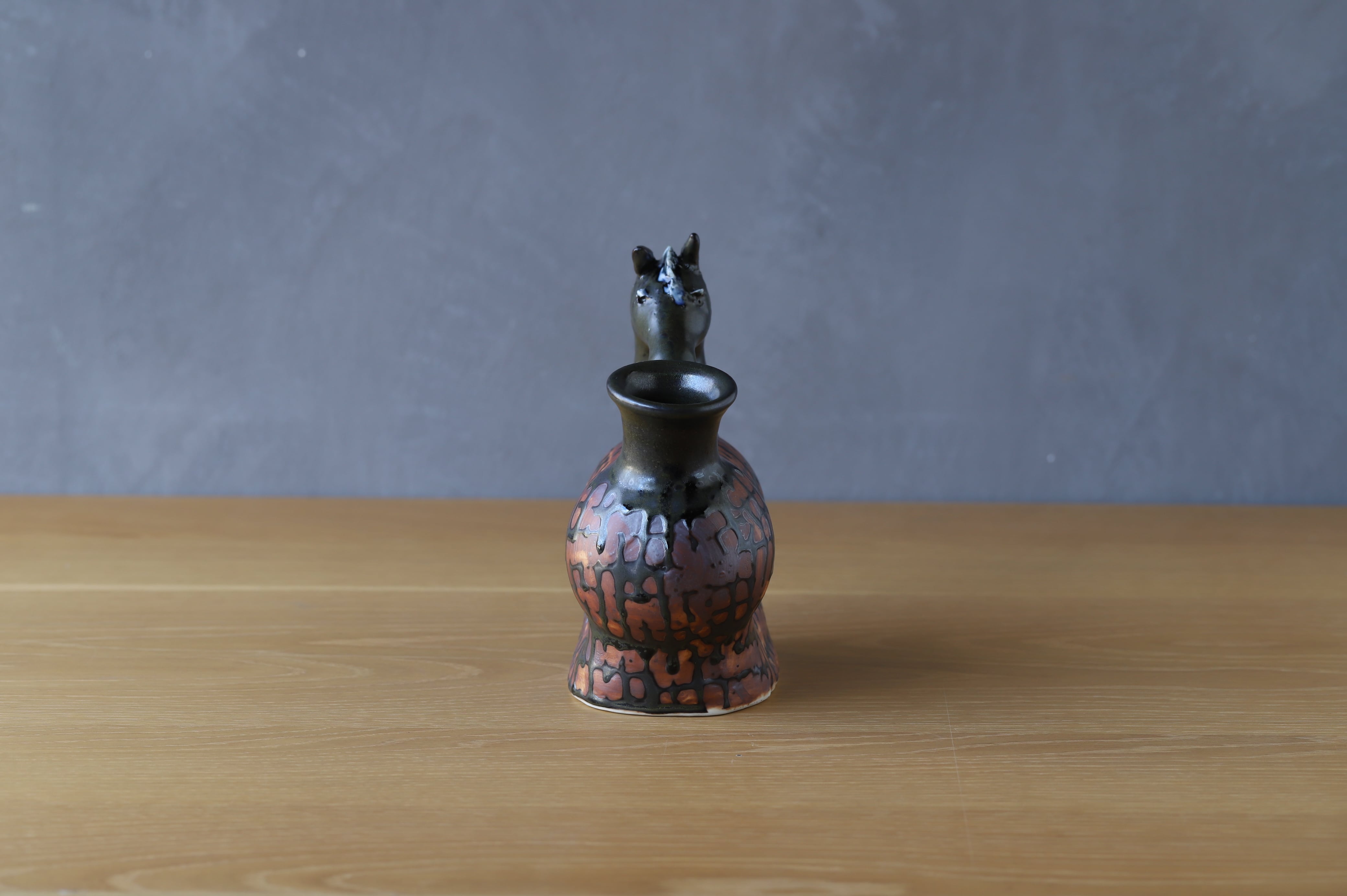 耳と立て髪以外はろくろで成形しています。様々な釉薬の流れとウマの躍動感が溶け込んだ作品です。
